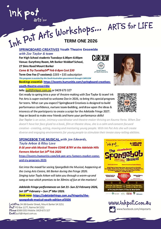Ink Pot Arts Inc is a not-for-profit organisation in Mount Barker, South Australia, offering fun and supportive performing arts programs for people of all ages and abilities. Their workshops—led by creative professionals—include drama, musical theatre, music, and wellbeing arts, helping people build skills and connect with others.